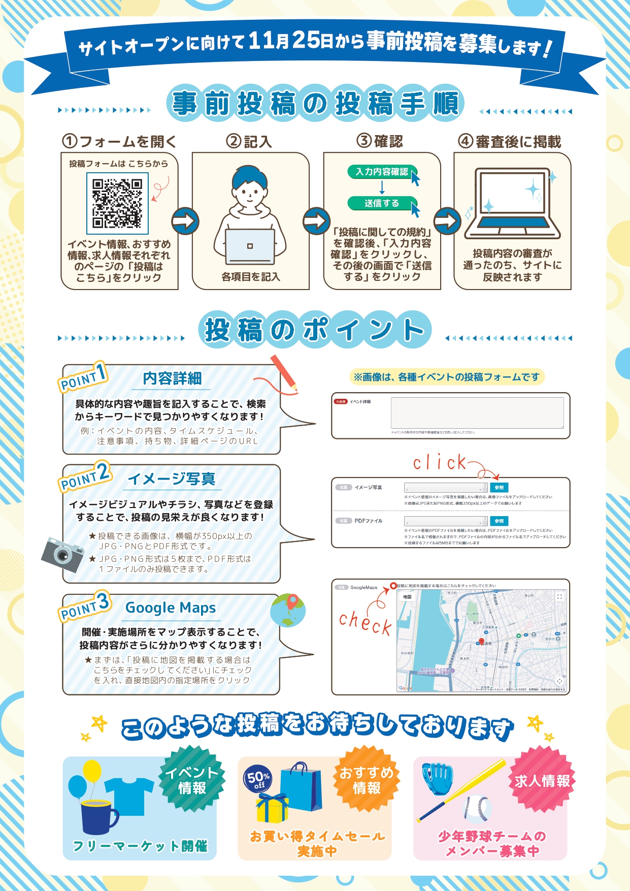 2026年1月のサイトオープンにあたり、11月25日より皆さまからの市内のイベント情報やおすすめ情報、求人情報の事前募集がスタートしました。