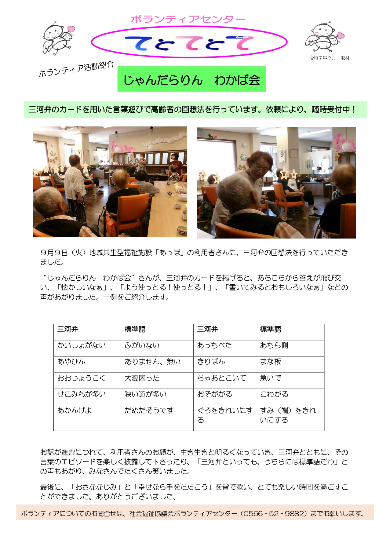 三河弁のカードを用いた言葉遊びで回想法を行っていただきました。多くの三河弁に触れ、利用者さんからは、「うちらにとっては標準語だわ」との声もあがり、皆さんでたくさん笑い、楽しい時間をすごすことができました。