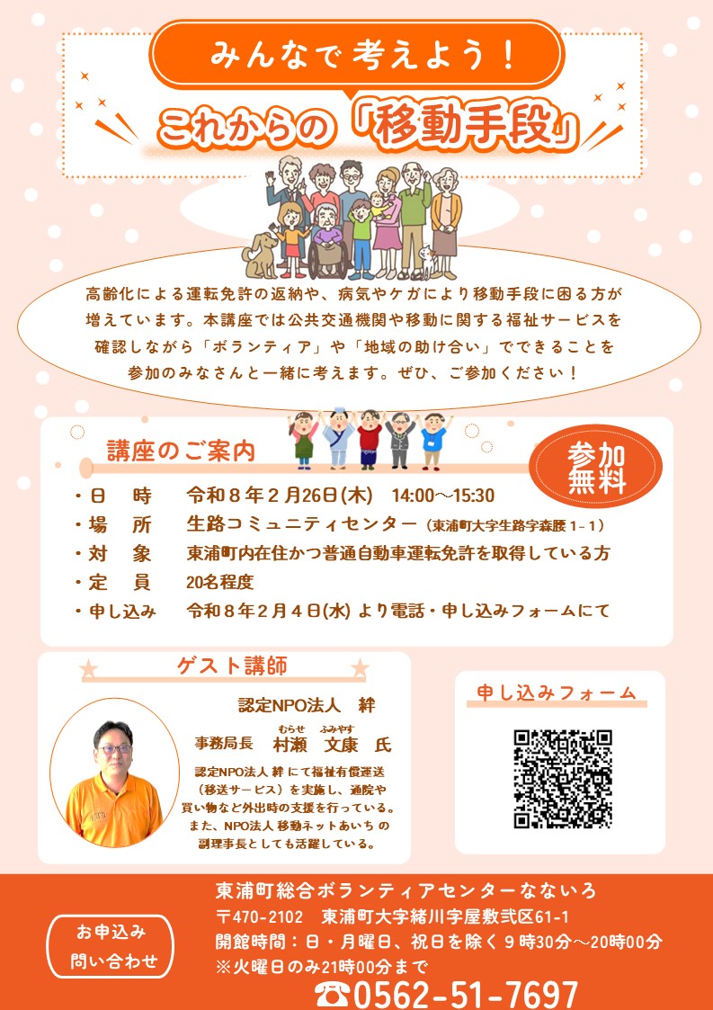 | 問い合わせ先 | 東浦町総合ボランティアセンターなないろ ☎0562-51-7697 |