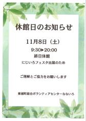 令和7年11月8日(土)は、産業まつりと同時開催「にじいろフェスタ」へのなないろ出展に伴い、終日休館...