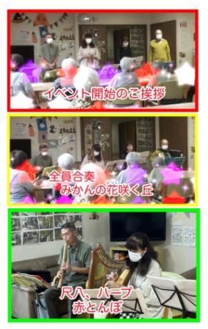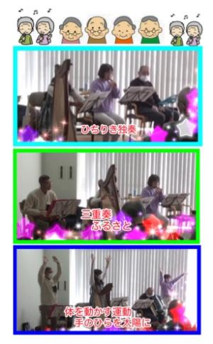 アコーディオン、ひちりき、尺八、ウクレレ、ハープなどの楽器で、童謡、懐メロ、その他の歌を伴奏し、みなさんに歌っていただくことを目的としています。