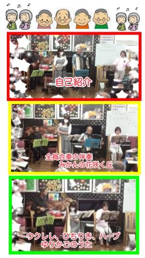 アコーディオン、ひちりき、尺八、ウクレレ、ハープなどの楽器で、童謡、懐メロ、その他の歌を伴奏し、みなさんに歌っていただくことを目的としています。